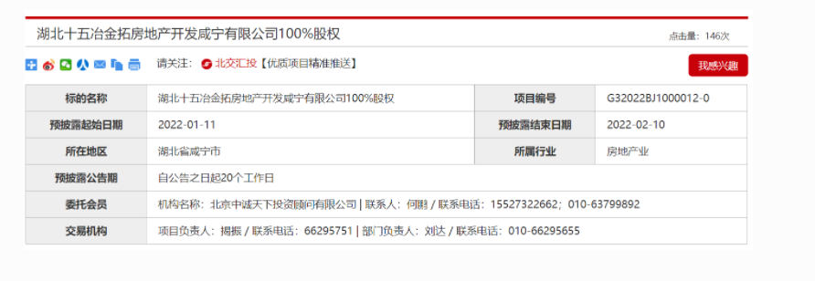 1月11日,據北京產權交易所披露,中國有色礦業集團有限公司擬轉讓湖北十五冶金拓房地產開發咸寧有限公司100%股權,信息預披露起止期為2022年1月11日至2022年2月10日。