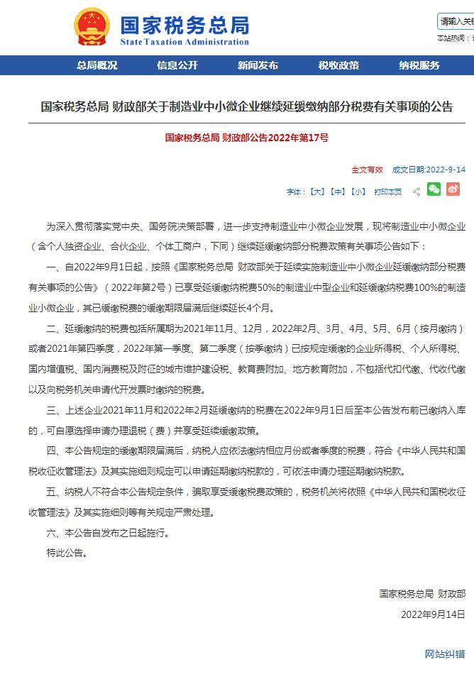 據國家稅務總局網站消息,國家稅務總局、財政部9月14日發布關于制造業中小微企業繼續延緩繳納部分稅費有關事項的公告。其中明確,自2022年9月1日起,按照《國家稅務總局財政部關于延續實施制造業中小微企業延緩繳納部分稅費有關事項的公告》(2022年第2號)已享受延緩繳納稅費50%的制造業中型企業和延緩繳納稅費100%的制造業小微企業,其已緩繳稅費的緩繳期限屆滿后繼續延長4個月。
